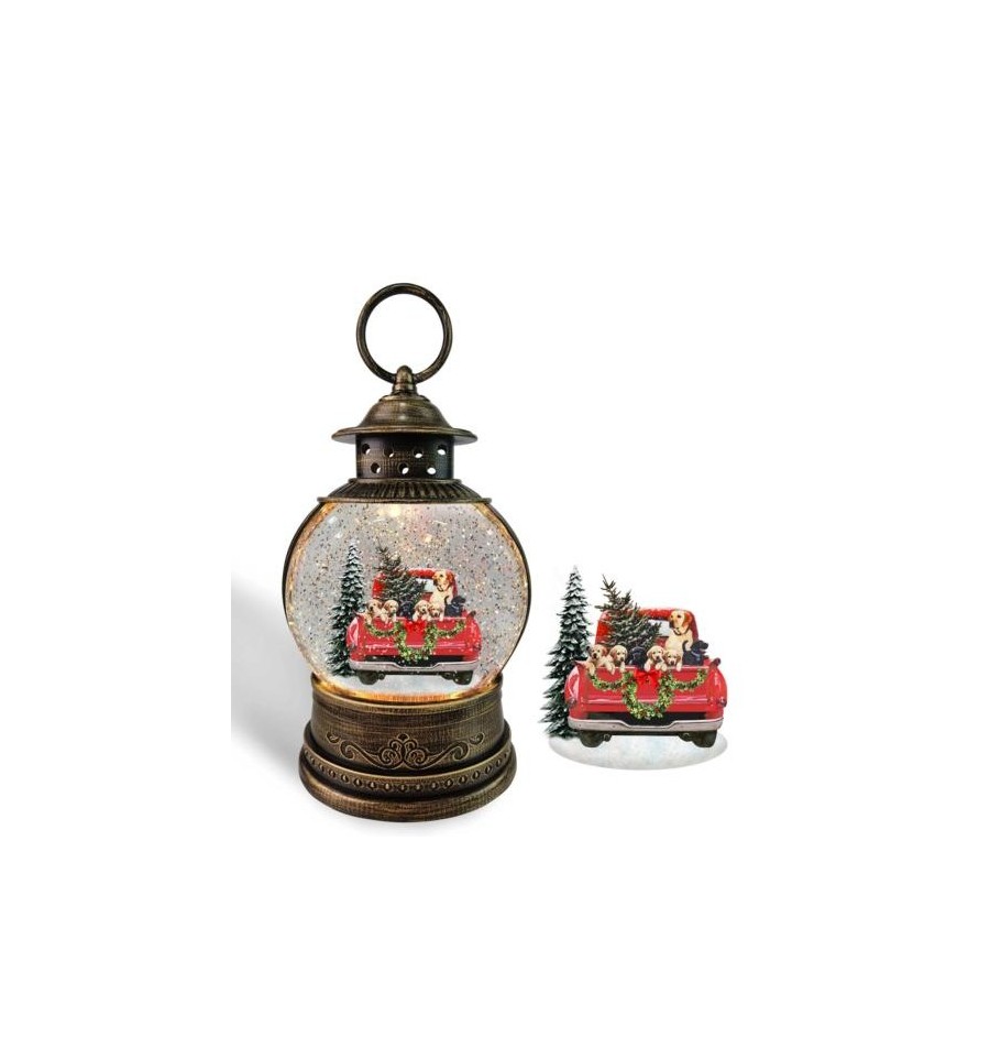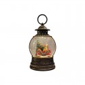 White glitter lantern with sledge scene. Plays a medley of 8 different Christmas melodies while it light up and the glitter swirls. 3 way switch: light & glitter, light, glitter & music, off. Battery operated. Height 25,5 cm
