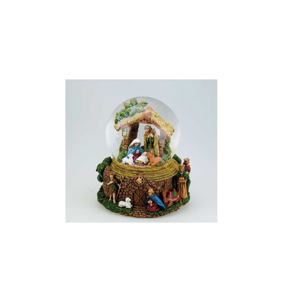 Snow globe nativity scene, Jesus in the crib, plays “Silent night”
