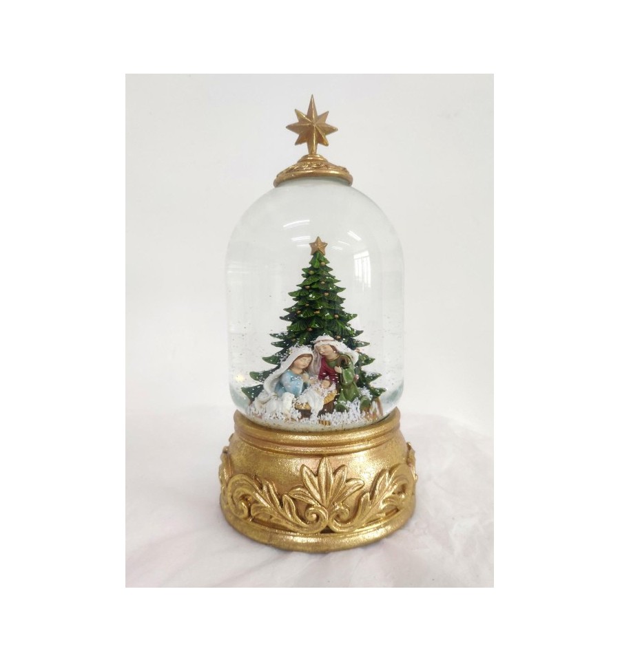 Snow globe nativity scene, Jesus in the crib, plays “Silent night”