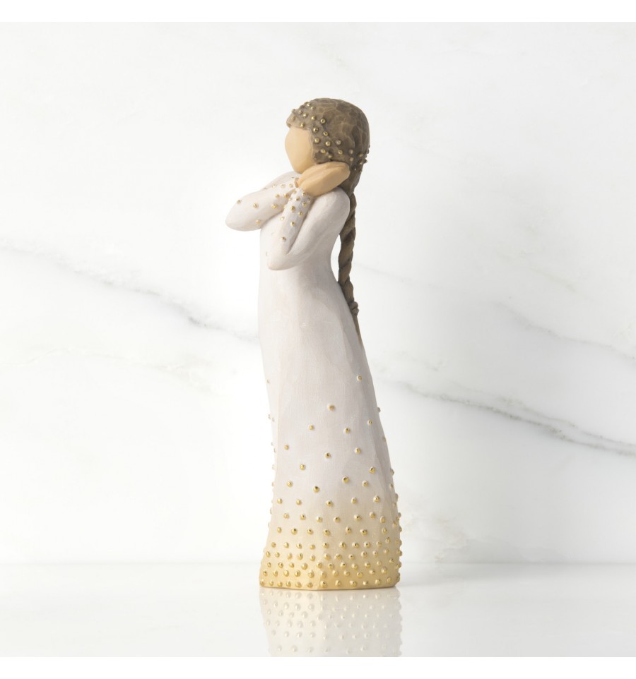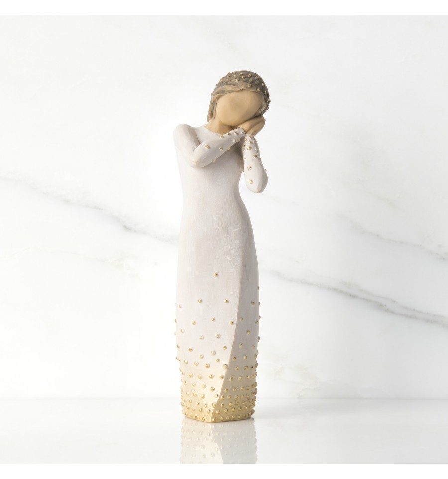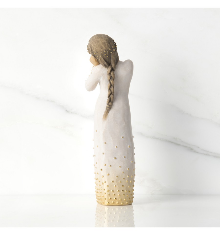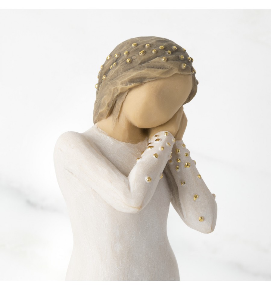 Willow Tree is an intimate line of figurative sculptures representing sentiments of love, closeness, healing, courage, hope...all the emotions we encounter in life. A new addition to the Signature Collection, which was first launched in 2015 to mark the 15th anniversary of Willow Tree, the Wishing figure has a beautiful gesture and sentiment determind by the giver and receiver. A hopeful wish for future aspirations, a 'missing you' wish of friendship, a healing wish of comfort, an addition to the Nativity. "This is a very open piece, in which the giver and receiver participate in defining its meaning. At Christmas time, Wishing can be added to the Nativity display. Her golden halo and angelic gesture with the other figures all play a part to tell a story' - Susan Lordi. The item is made of cast stone and hand-painted with lead-free paint. Supplied in a special gold highlighted branded gift box with a special corresponding gift tag with sentiment 'A beautiful wish for you...'. Not a toy or children's product. Intended for adults only.