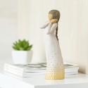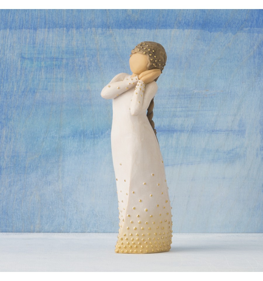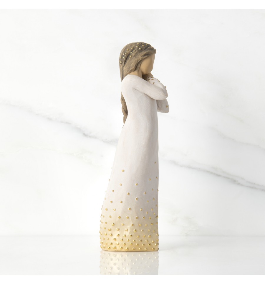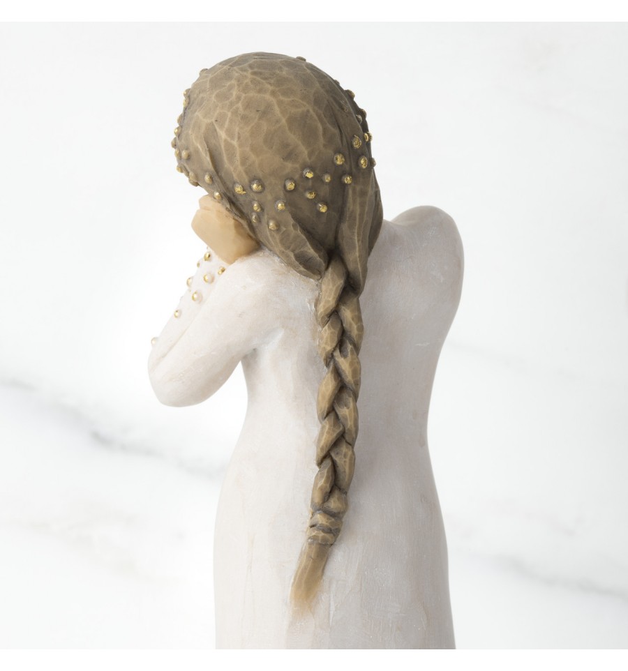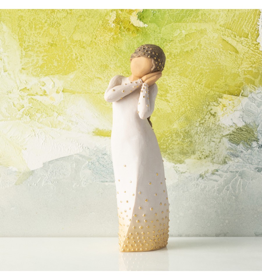 Willow Tree is an intimate line of figurative sculptures representing sentiments of love, closeness, healing, courage, hope...all the emotions we encounter in life. A new addition to the Signature Collection, which was first launched in 2015 to mark the 15th anniversary of Willow Tree, the Wishing figure has a beautiful gesture and sentiment determind by the giver and receiver. A hopeful wish for future aspirations, a 'missing you' wish of friendship, a healing wish of comfort, an addition to the Nativity. "This is a very open piece, in which the giver and receiver participate in defining its meaning. At Christmas time, Wishing can be added to the Nativity display. Her golden halo and angelic gesture with the other figures all play a part to tell a story' - Susan Lordi. The item is made of cast stone and hand-painted with lead-free paint. Supplied in a special gold highlighted branded gift box with a special corresponding gift tag with sentiment 'A beautiful wish for you...'. Not a toy or children's product. Intended for adults only.