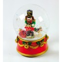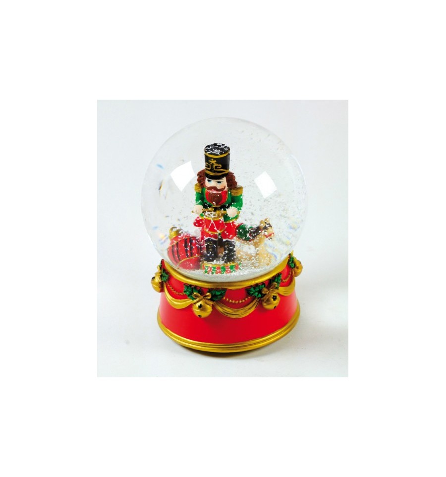 O quebra-nozes num globo de neve de 12 cm sobre uma base decorada a vermelho toca a música “Nutcracker Suite”.