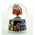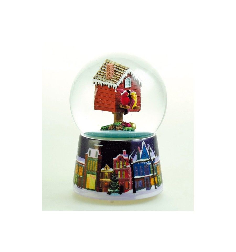 Globo de neve com um par de cardeais em frente a uma casa de pássaros.