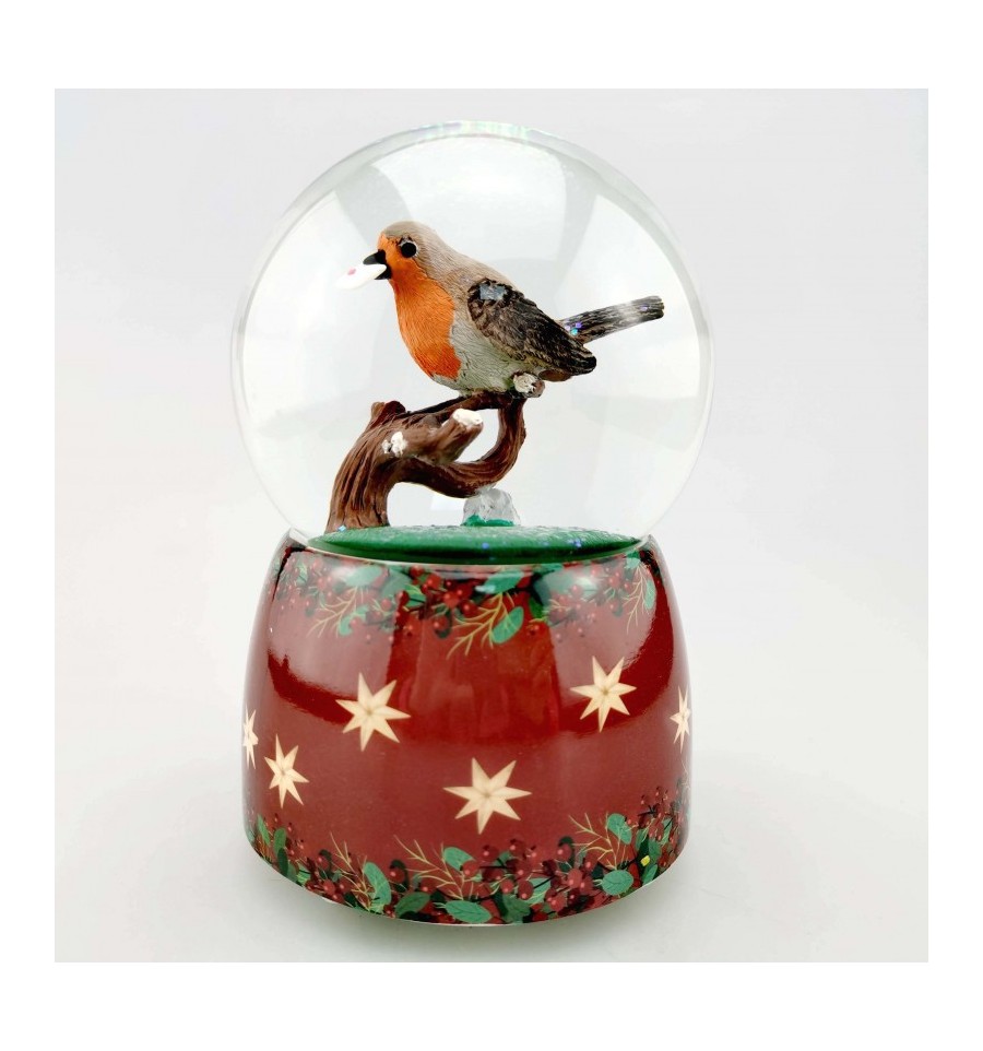 Globo brilhante Pardal de 10 cm, com uma Carta de Natal no bico a rodar ao som da melodia „Hark! Os anjos arautos cantam „