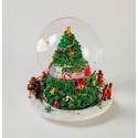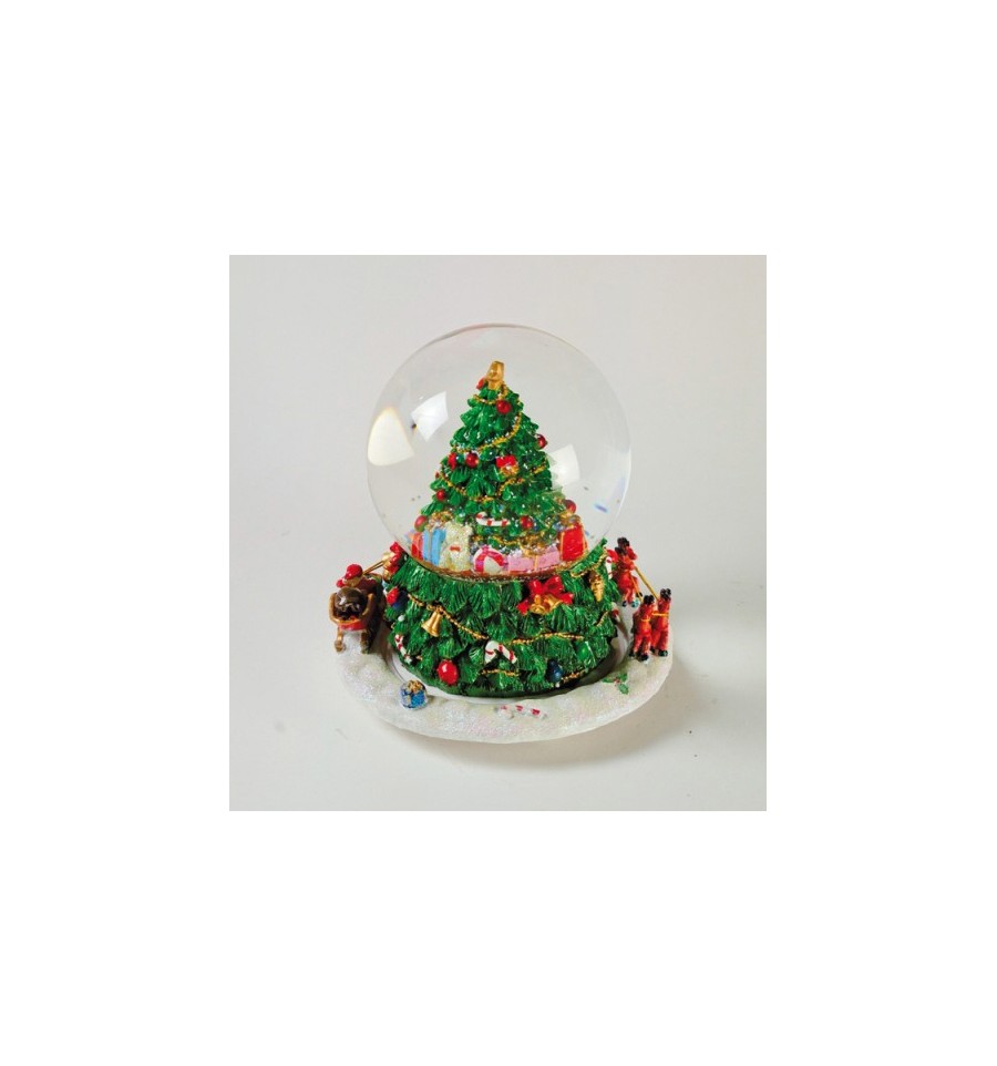 Globo de neve 120 mm. No interior, uma árvore de Natal decorada gira enquanto no exterior, o Pai Natal circula a bola com o seu trenó de renas e soa uma melodia de Natal.