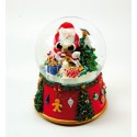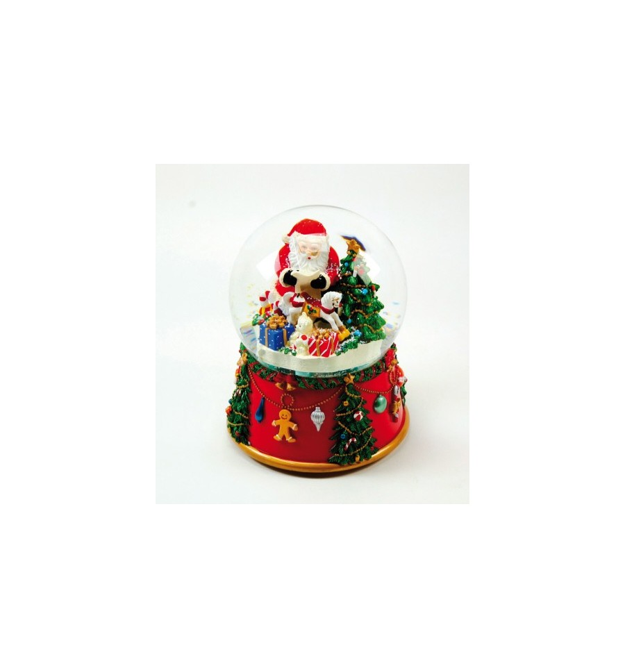 Globo de neve de 150 mm com Pai Natal e presentes na árvore de Natal. A caixa de música incorporada toca uma melodia de Natal.