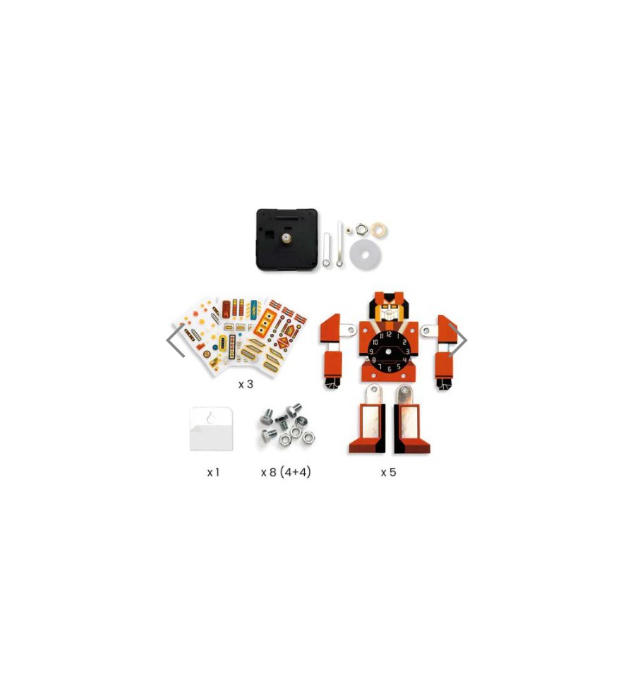 Um kit criativo com relógio para decorar e montar com mais de 80 decalques e acessórios. Usando um lápis, esfregue em cima dos decalques para transferi-los para as 5 peças do relógio de cartão. Em seguida, enrosque as porcas e os parafusos para montar o robô. Só falta montar o mecanismo. Um belo objeto decorativo que também dá horas.