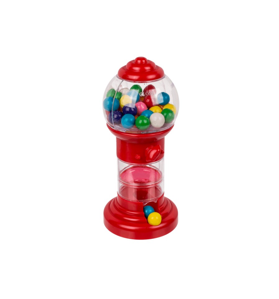 Máquina de pastilhas elásticas vintage, com aprox. 60 g de pastilhas elásticas, 19 cm de altura, e 2 cores: vermelho ou azul.