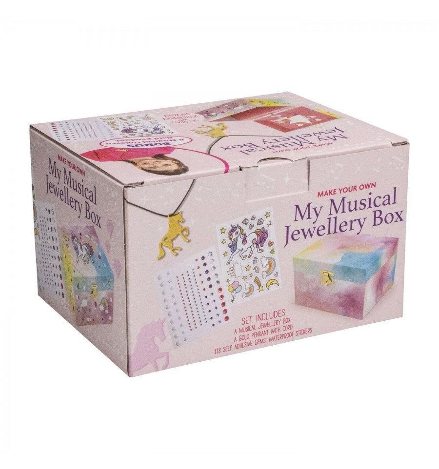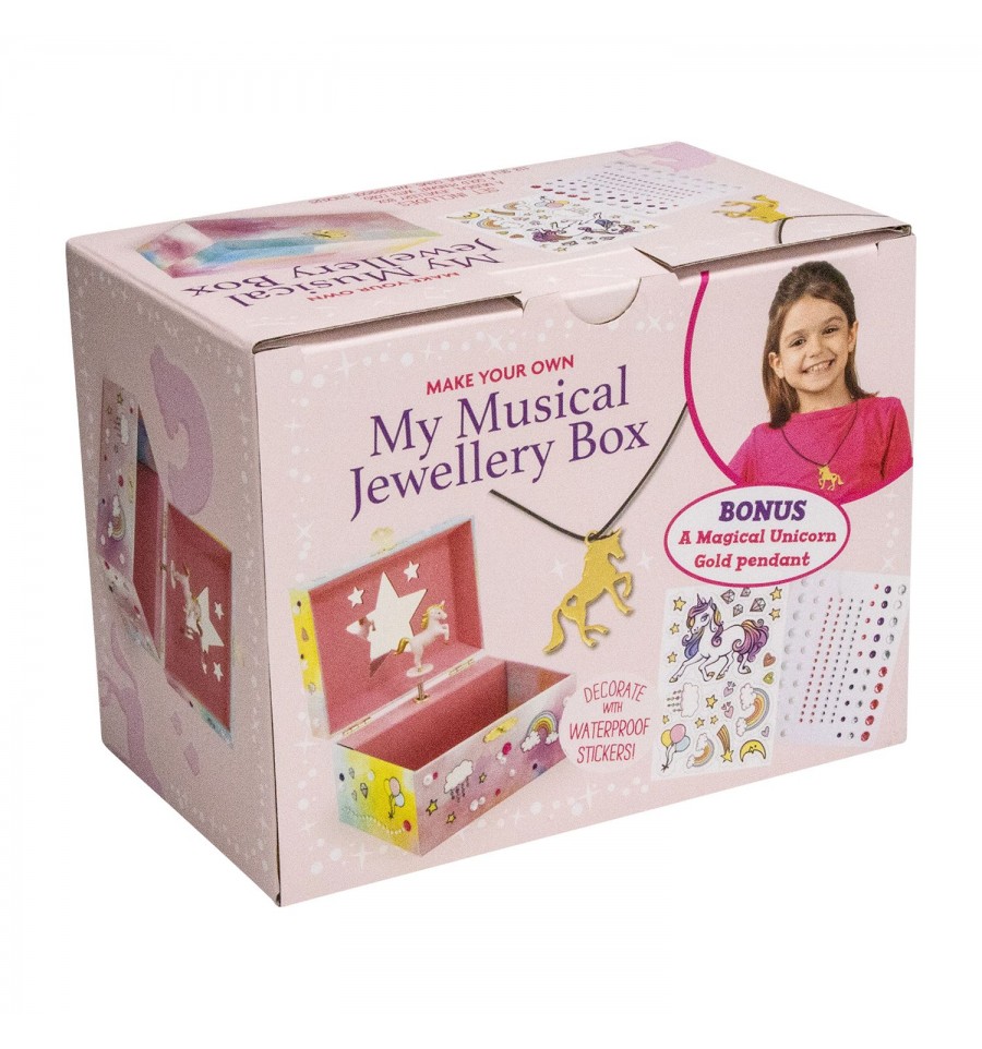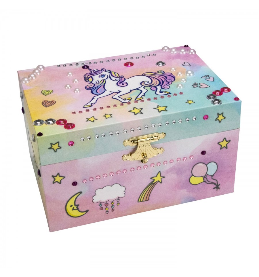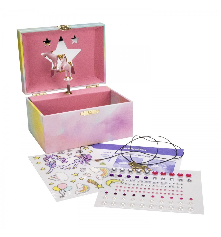 Uma linda caixa de joias de unicórnio para meninas com uma caixa de música para artesanato criativo e DIY. A nossa caixa de música, que possui uma caixa de música de alta qualidade com corda mecânica, é o local perfeito para guardar as joias do seu filho. A figura dançante e o espelho de plástico, bem como o forro aveludado macio, garantem o armazenamento seguro de joias ou outros artigos favoritos. Esta encantadora caixa de joias é perfeita para os pequenos fãs de unicórnios. Apresenta um design rosa nostálgico e pode ser decorada com autocolantes e pedras preciosas adesivas. Ao ser aberta, surge uma figura de unicórnio, girando ao som da música da caixa de música embutida. O interior da caixa é flocado e oferece vários compartimentos para guardar joias. Dimensões da caixa: C 15 x L 13 x A 9 cm. Esta caixa de joias não é apenas uma opção prática de arrumação, mas também uma peça decorativa encantadora para o quarto de qualquer criança.
