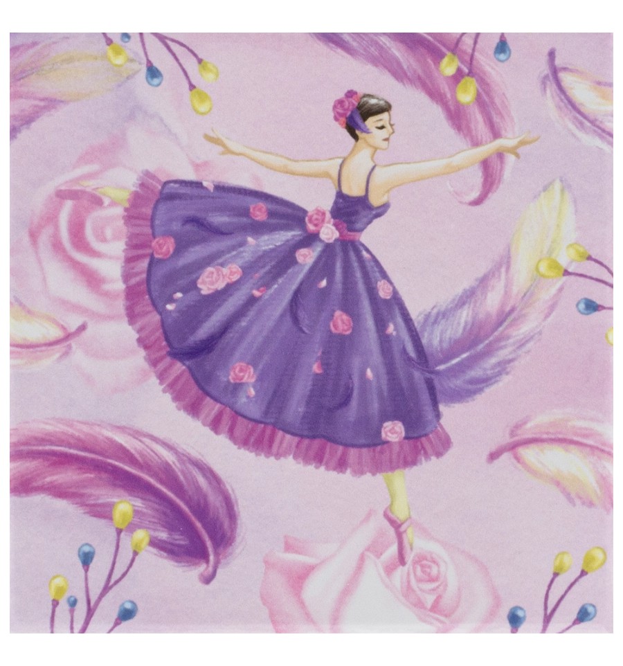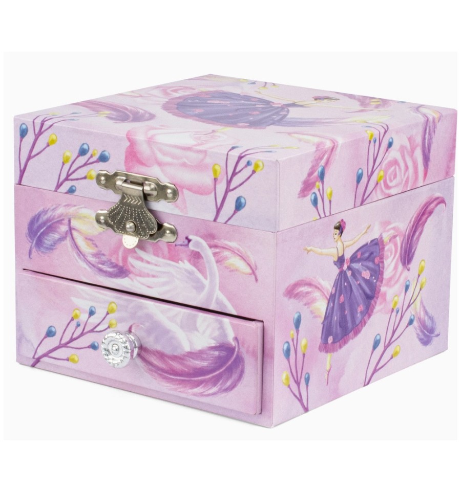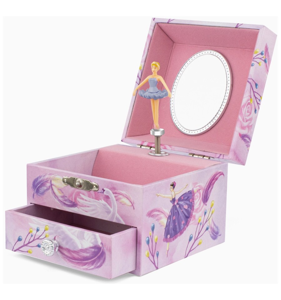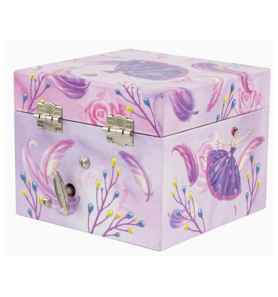 Com decoração de penas e uma bailarina, o conjunto conta com um espelho oval e dois compartimentos, sendo um deles uma gaveta. Ao abrir, a bailarina ganha vida e gira graciosamente ao som da música. A música pára ao fechar a caixa