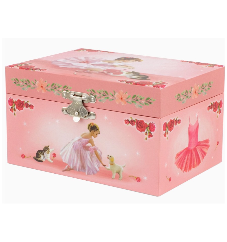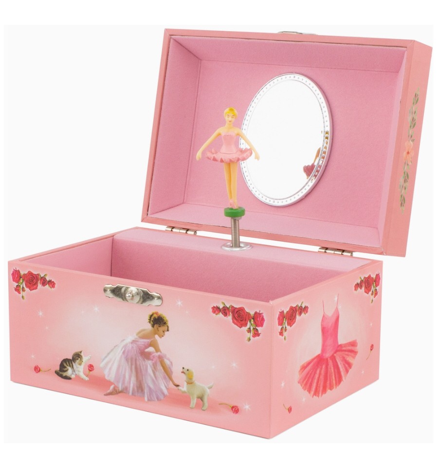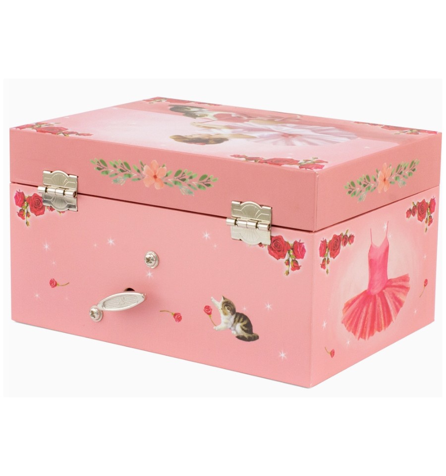 Representando uma pequena bailarina com um gatinho, esta caixa de música é composta por um espelho oval e um compartimento interno. Ao abrir a caixa, a bailarina ganha vida e gira ao som da música. Ao fechar a caixa, a música para.