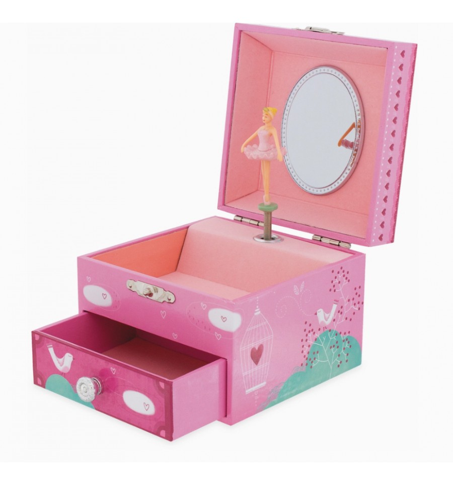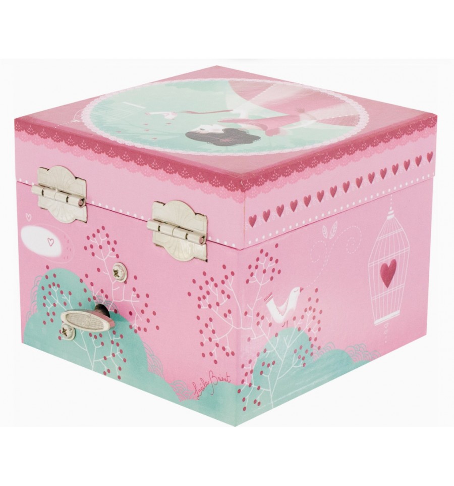 Caixa musical quadrada com mecanismo de corda manual na parte de trás do baú. Representando uma jovem garota e seu pássaro, esta caixa musical inclui um espelho oval e dois compartimentos, sendo um deles uma gaveta. Ao abrir a caixa, uma bailarina ganha vida e gira ao som de uma música delicada. © Design de Leïla Brient