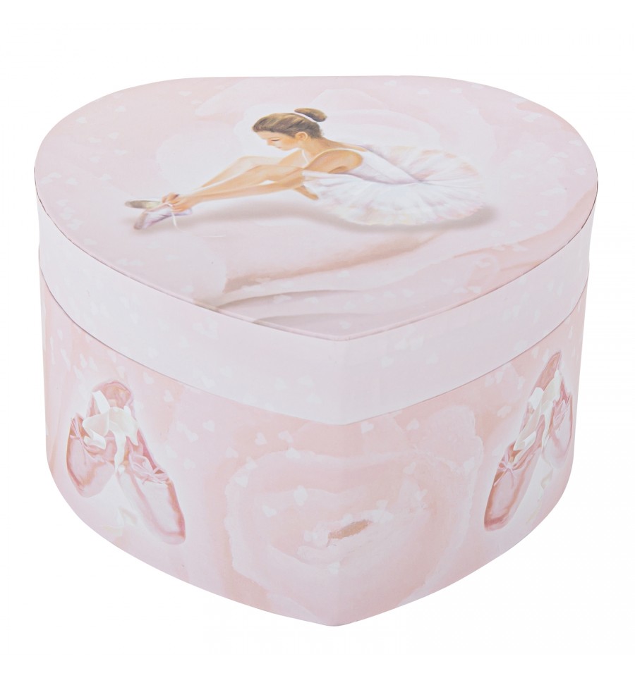 Caixa em forma de coração para joias em madeira forrada. Roda a corda, e quando se abre a caixa, aparece uma pequena bailarina que gira ao som da melodia Lago dos cisnes.