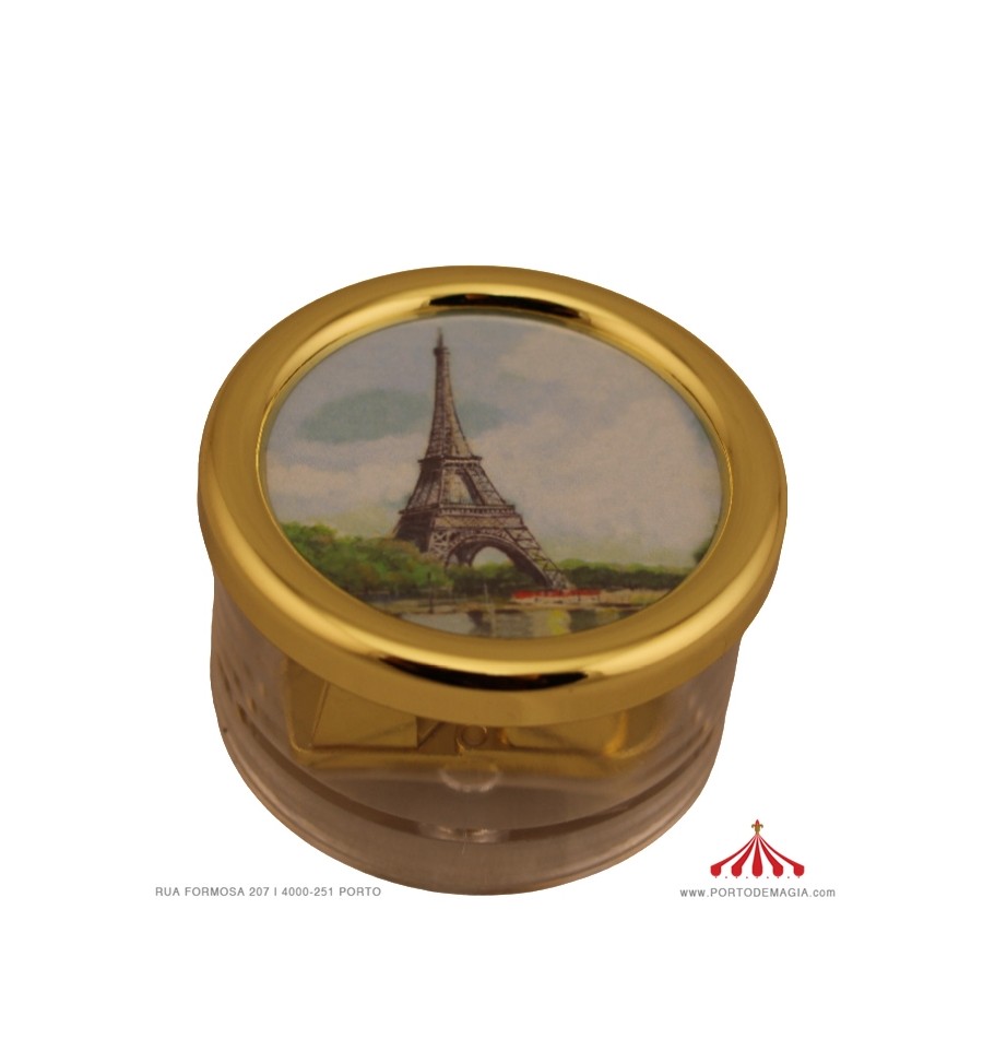 Caixa de Música Paris. O movimento mecânico pode ser pausado com um batente. Ao rodar a tecla de corda na parte inferior, começa a tocar uma música conhecida.