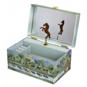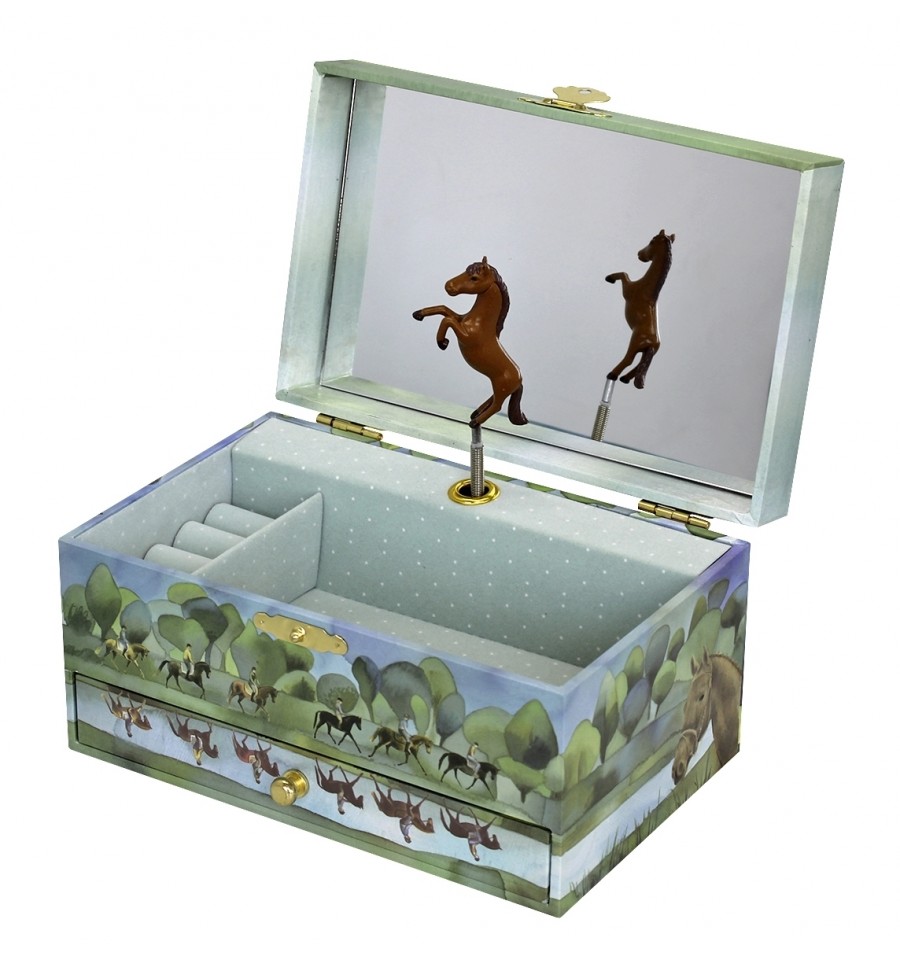 UMA CAIXA DE MÚSICA: Esta caixa de música, com gaveta, possui um botão de grandes dimensões. Espelho e porta-anéis farão as delícias de uma menina que poderá guardar as suas jóias e segredos dentro desta caixa de música. Roda a manivela e a figura do cavalo ganha vida magicamente ao som da música!
