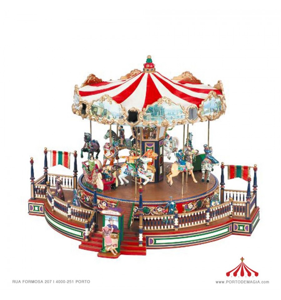Holiday around the Carousel. Este carrossel com anteparo é uma réplica detalhada de um carrossel antigo. Os 10 animais movem-se para cima e para baixo enquanto o carrossel gira ao som de 15 músicas natalinas e 15 músicas de feiras (selecionáveis). Largura 380 mm. Funciona com corrente elétrica (adaptador incluído)