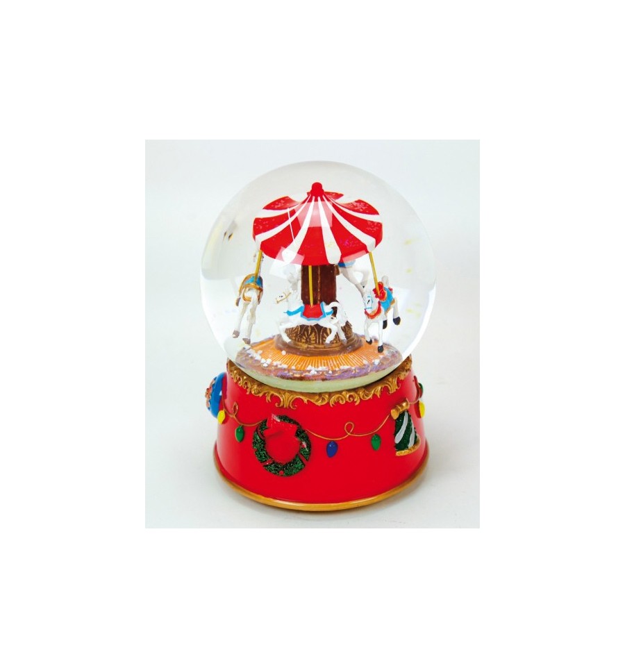 Globo de neve de 120 mm com carrossel. O carrossel com os seus cavalos gira na bola enquanto toca uma melodia de Natal.