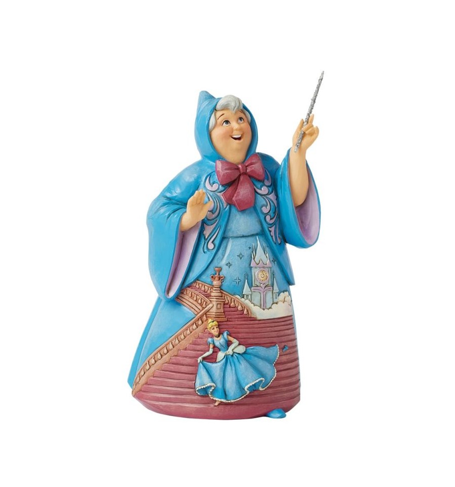 Neste design mágico de Jim Shore, a Fada Madrinha sorri com a sua varinha, as suas vestes azuis pintadas com rosemaling abrindo-se para revelar a Cinderela a descer a correr os degraus enquanto o relógio bate a meia-noite. Este momento cativante é quando ela perderá o seu sapatinho de cristal.