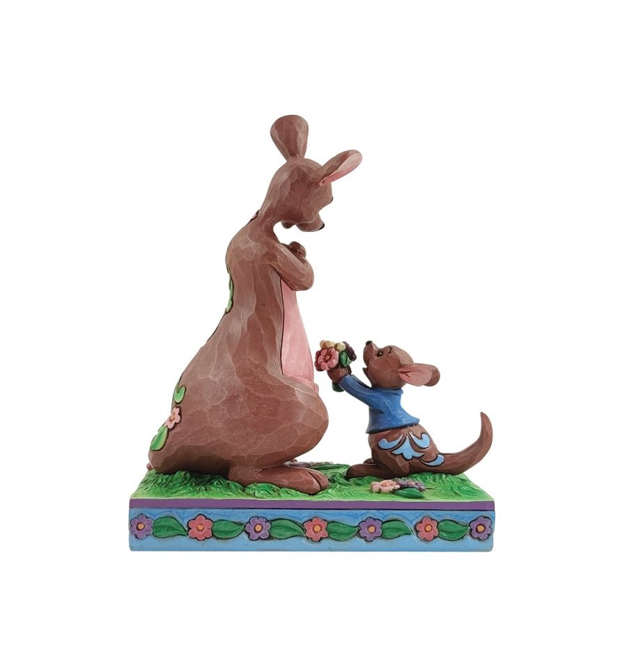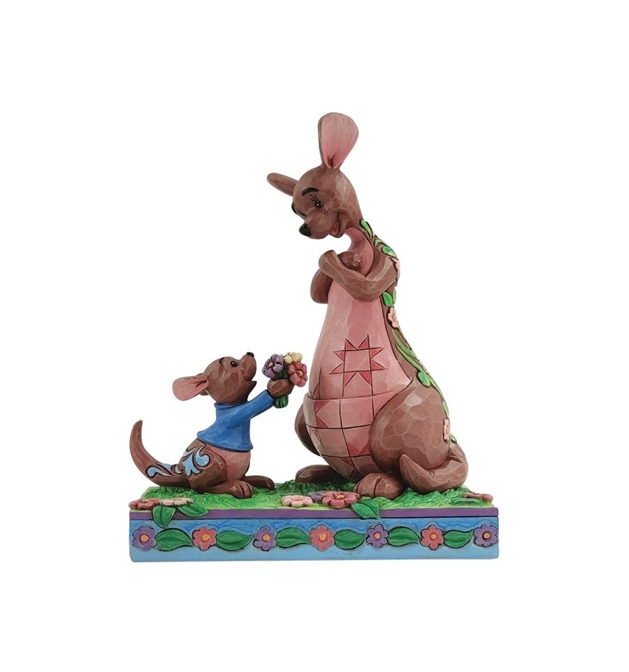 "O presente mais doce" A turma do Ursinho Pooh aproveita a primavera no Bosque dos Cem Acres. Kanga e Roo colhem flores silvestres no ar fresco da manhã. Gravado com flores e patchwork, o canguru modelado por Jim Shore aceita o presente recém-colhido da sua cria com um sorriso.