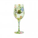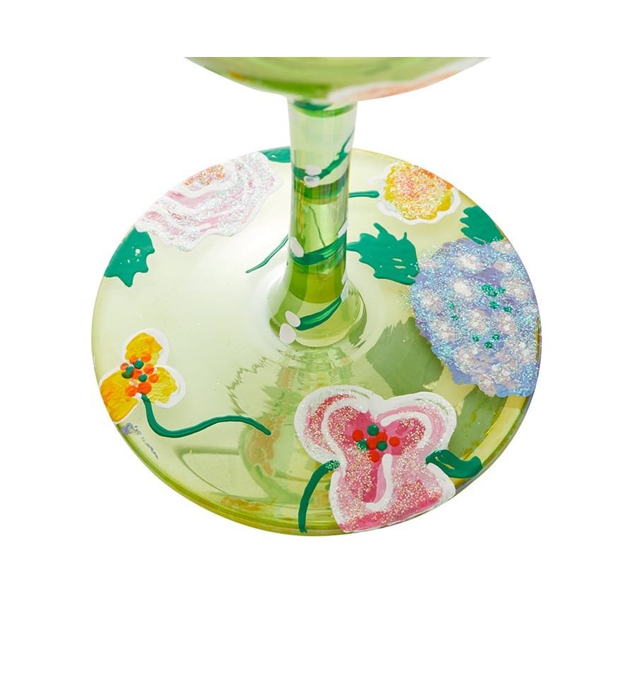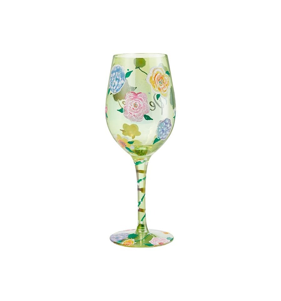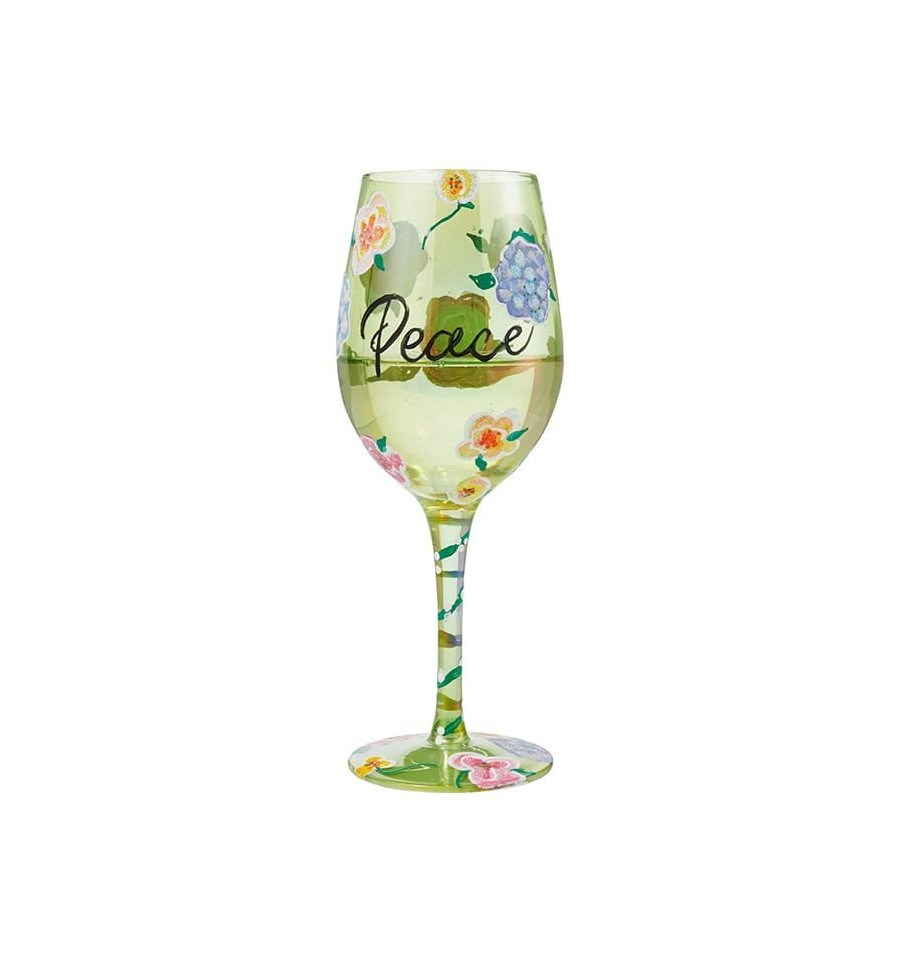 Dê um brinde à Paz com este copo de vinho, com elegantes tons de verde e pétalas pintadas, sentirá a harmonia à sua volta. Vem numa bonita caixa de oferta com a assinatura da Lolita.