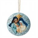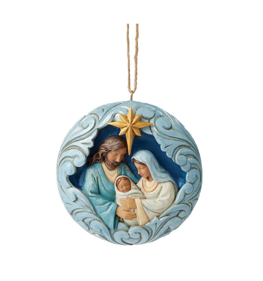 Este enfeite Jim Shore emoldura lindamente a Sagrada Família num intrincado rosemaling, com a estrela de Natal dourada acima deles sobre um fundo azul sereno. O abraço terno e os detalhes delicados evocam uma sensação de paz e maravilha divina.