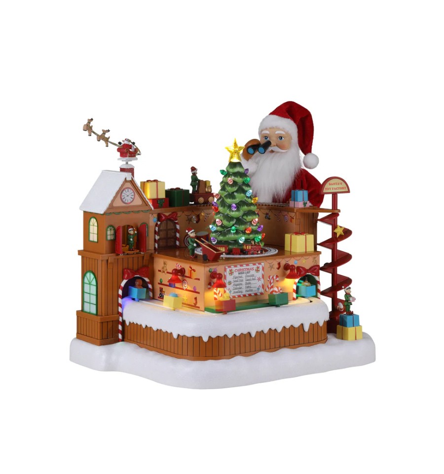 A nossa Oficina Animada de Brinquedos do Pai Natal é mais do que apenas uma peça decorativa. Veja o Pai Natal e os seus duendes a trabalhar arduamente na fábrica de brinquedos, preparando os presentes.