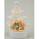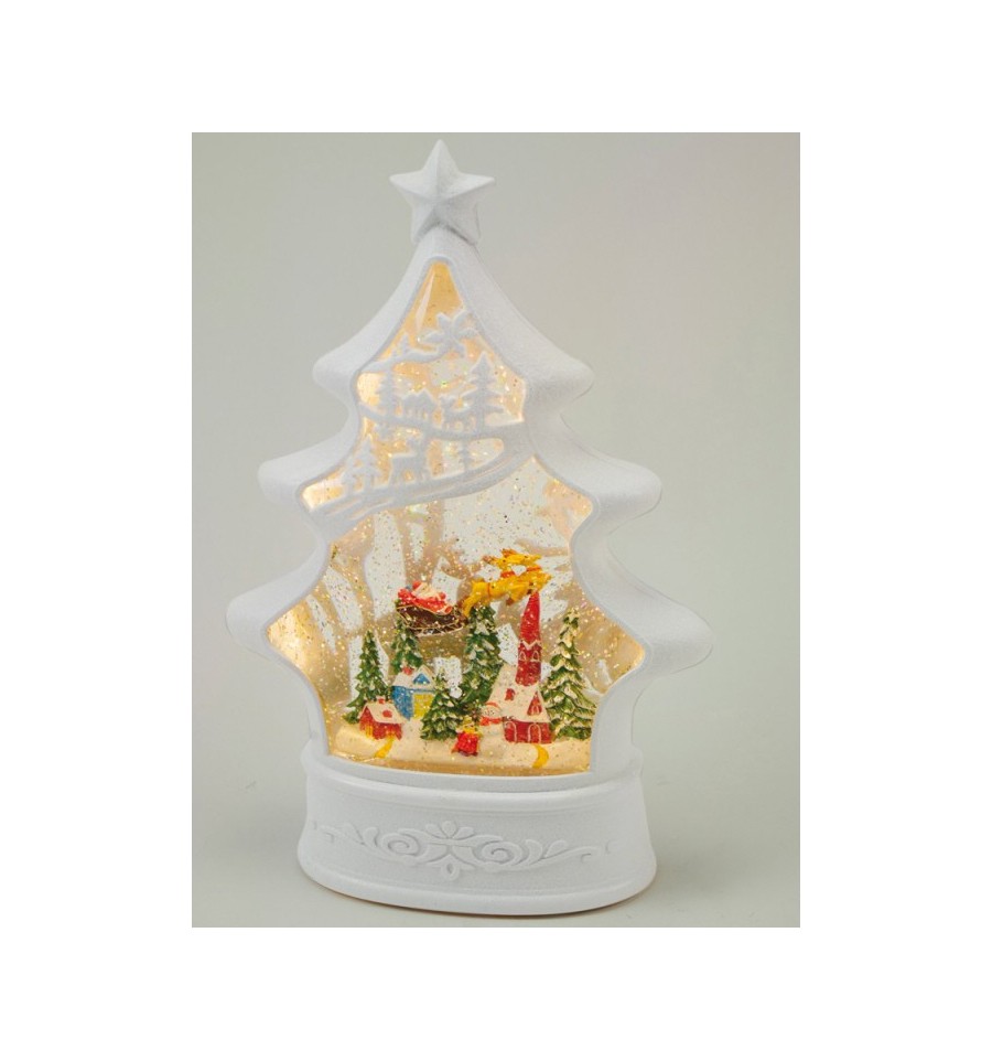 Árvore de Natal branca com bola brilhante - Pai Natal no trenó sobre a cidade. O brilho da bola gira à luz dos LEDs brancos quentes enquanto é tocado um medley de 8 canções de Natal diferentes.