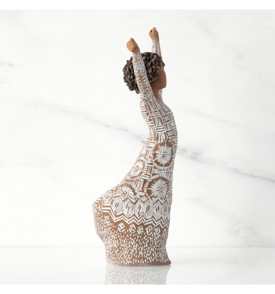"Coragem de ser vista, para ser ouvida, para ser curada" Susan Lordi quer celebrar a herança com esta peça mostrando-a através do tradicional pano de Kente tecido africano e marcas no vestido. Como afirma Susan Lordi : "Coragem para ser vista, para ser ouvida, para ser curada" Susan Lordi quer celebrar a herança com esta peça mostrando-o através do tradicional pano de Kente tecido africano e marcas no vestido. Como susan Lordi afirma "" Ela está a expressar quem ela é e a celebrar a cor da sua pele. Sua pele brilha através e contrasta com os padrões animados. A sua postura exuberante é uma representação física do que espero que ela sinta dentro de si. Todas as nossas novas peças do Willow Tree vêm em embalagens recicláveis