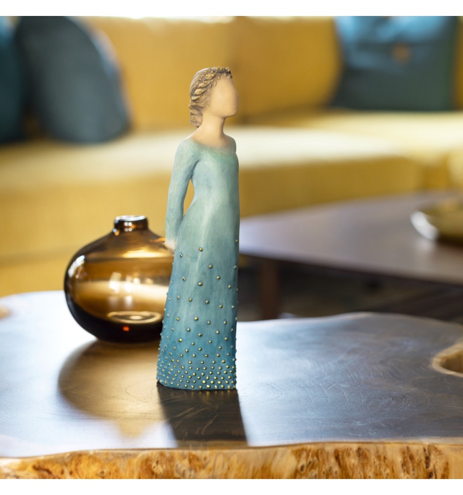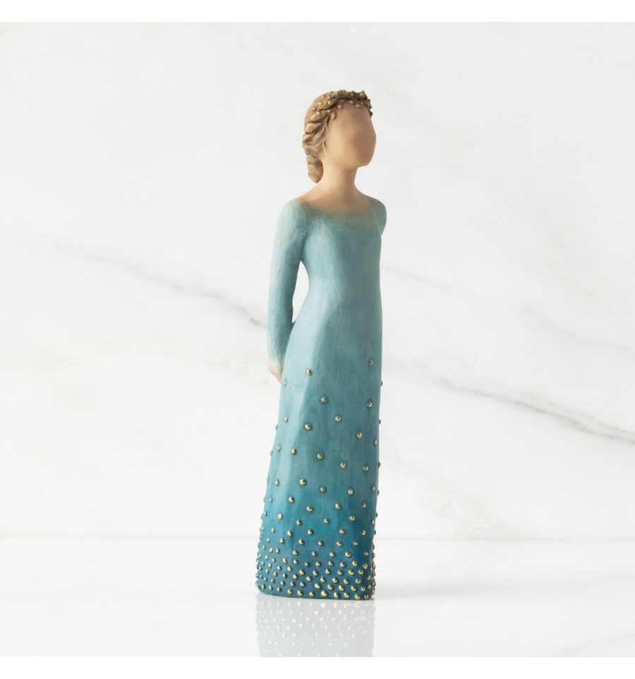 Para quem pratica a autocompaixão e prioriza o bem-estar. Radiance está disponível em dois tons de pele. Esta peça tem a pele e o cabelo mais claros; o seu cabelo e ombre azul profundo? vestido são salpicados com folhas de ouro. Vem numa caixa de apresentação da marca, perfeita para oferecer.